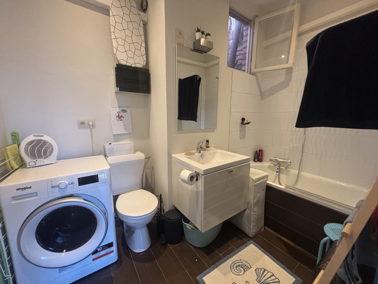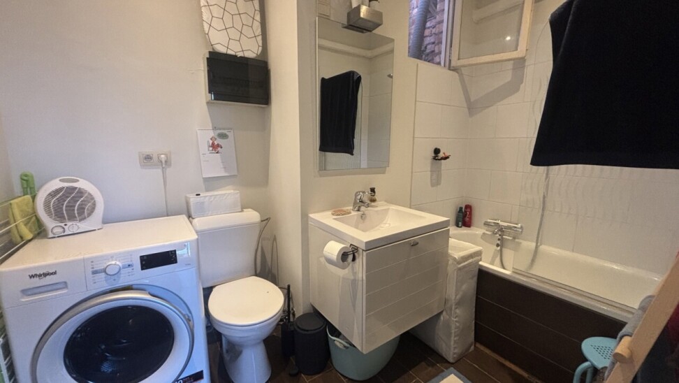 De badkamer is uitgerust met een lavabo, bad met douchefunctie, toilet en aansluitingen voor zowel wasmachine als droogkast.