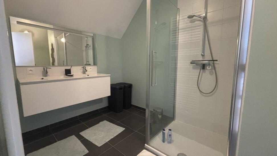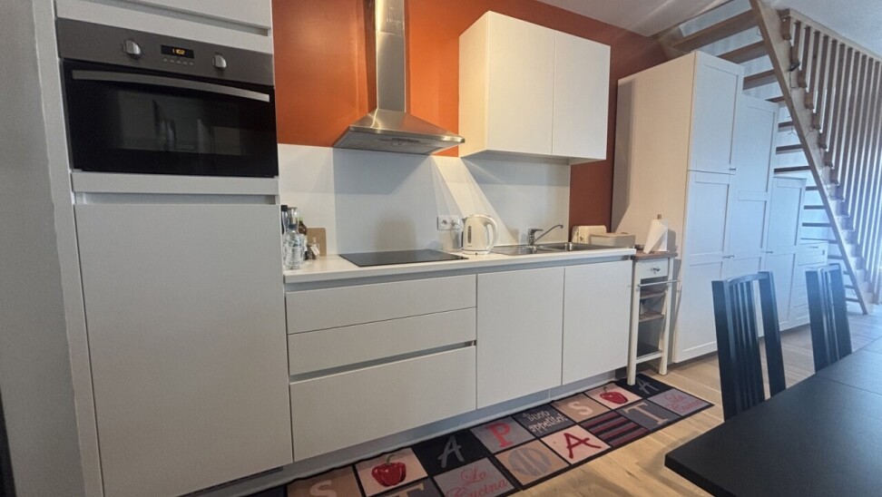 Het appartement omvat op de gelijkvloerse verdieping een volledig geïnstalleerde keuken met open leefruimte, een berging met aansluiting voor een wasmachine en een gastentoilet. Op de bovenverdieping bevinden zich de slaapkamer en een ruime badkamer. Daarnaast beschikt het appartementsgebouw ook over een privatieve ondergrondse fietsenstalling.