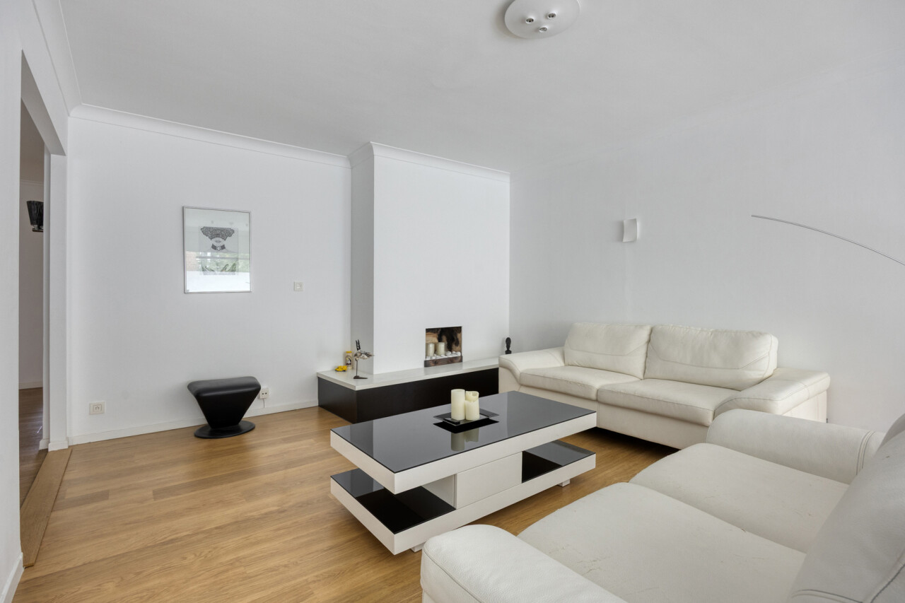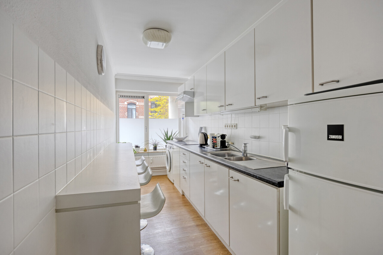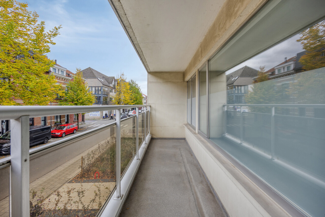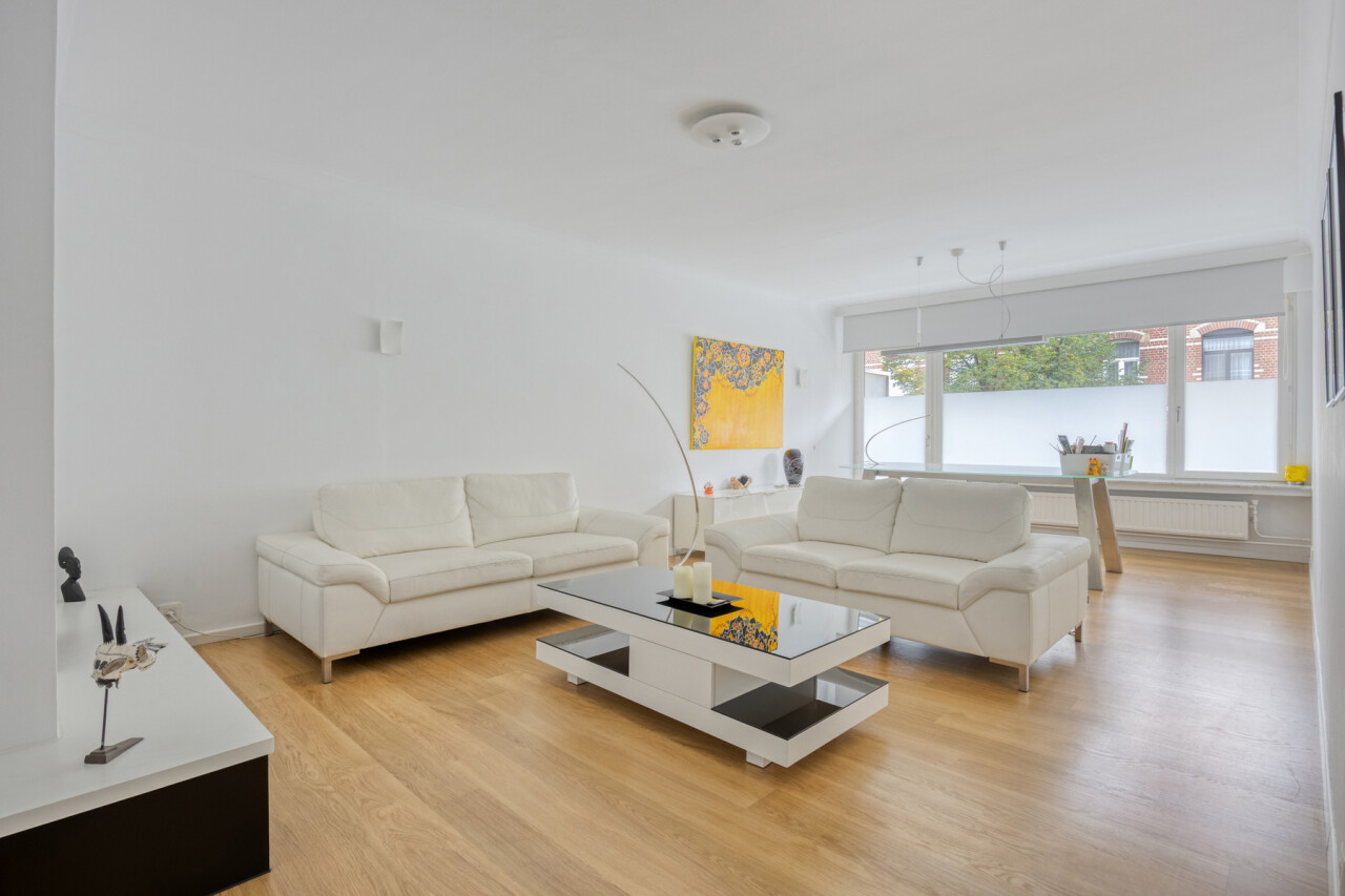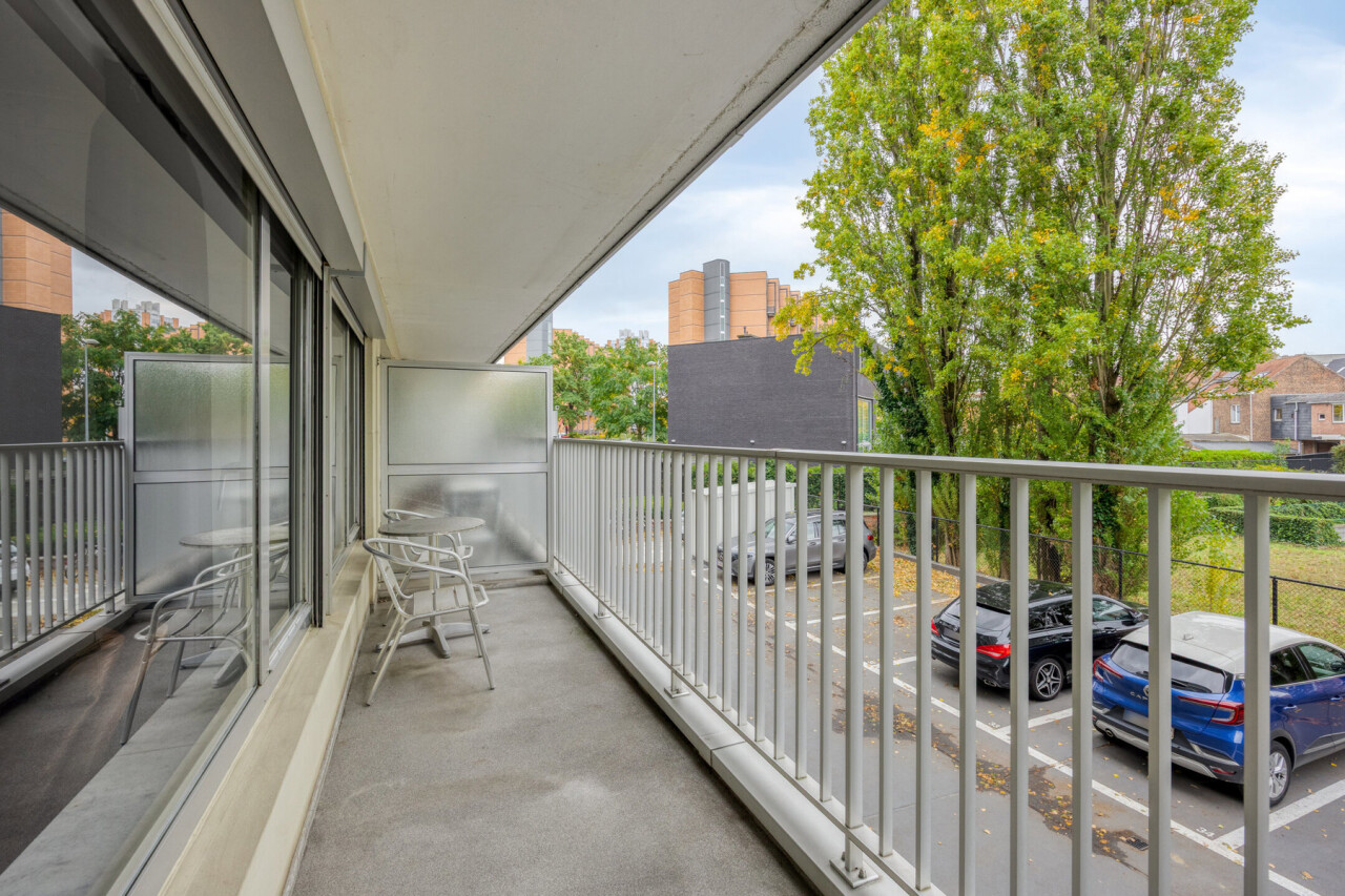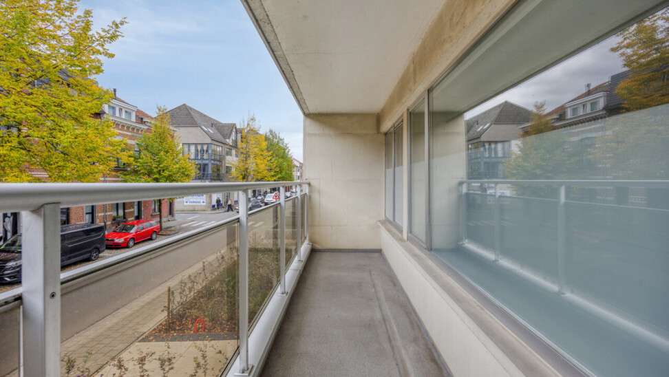 De ruime inkomhal leid je naar de lichtrijke leefruimte en de uitgeruste keuken. Dankzij de grote raampartijen is dit een aangename plek om te vertoeven. Aan de achterzijde van het appartement vind je twee comfortabele slaapkamers, een apart toilet en een badkamer met bad en lavabo.