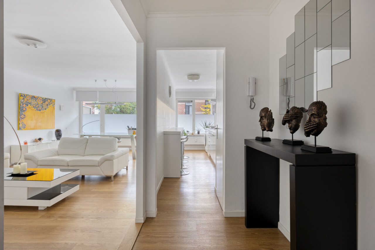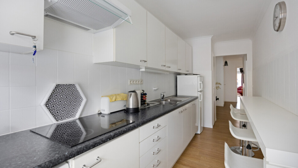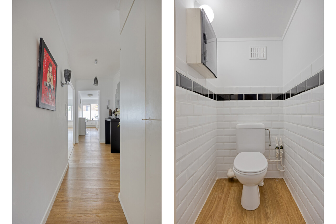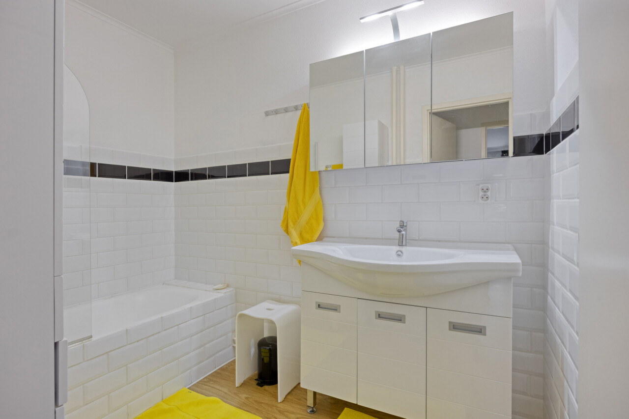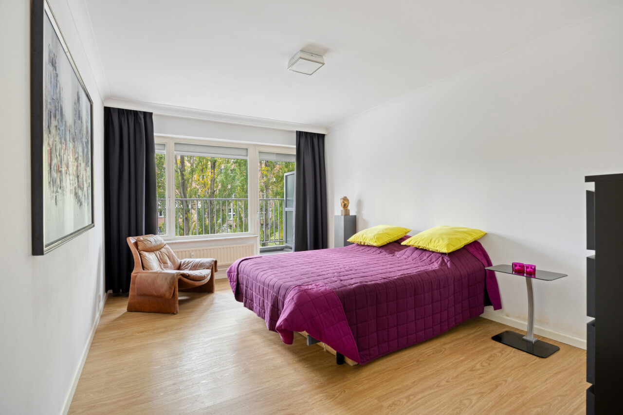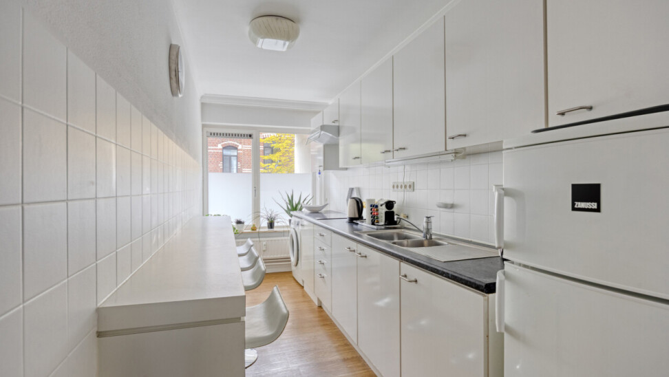 De ruime inkomhal leid je naar de lichtrijke leefruimte en de uitgeruste keuken. Dankzij de grote raampartijen is dit een aangename plek om te vertoeven. Aan de achterzijde van het appartement vind je twee comfortabele slaapkamers, een apart toilet en een badkamer met bad en lavabo.