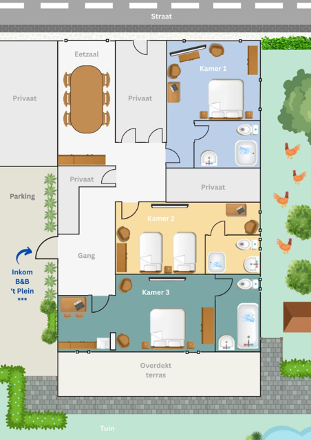 De B&B beschikt over drie sfeervol ingerichte kamers, elk voorzien van een eigen badkamer met douche, lavabo en toilet, wat garant staat voor optimaal comfort en privacy. Eén van de kamers is bovendien uitgerust met een keuken, ideaal voor langere verblijven.