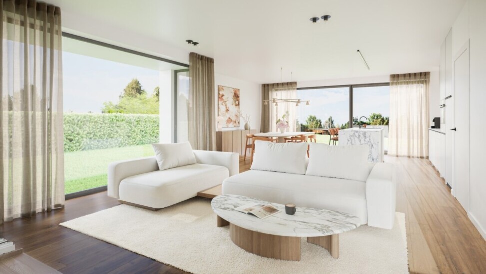 De lichtrijke leefruimte wordt gekenmerkt door grote raampartijen en een harmonieuze indeling in een gezellige zithoek, een ruime keuken met eethoek en een aparte bureauruimte. Aansluitend bevindt zich een ruime berging/wasruimte, die eveneens rechtstreeks toegankelijk is via een praktische zijdeur. Het grote schuifraam in de keuken en eethoek zorgt voor een naadloze overgang naar het terras en de ruime tuin.