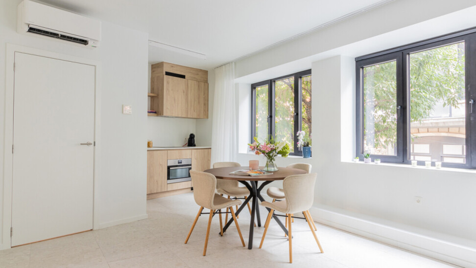 Elk appartement beschikt over een volledig uitgeruste keuken, een stijlvolle badkamer, een aparte slaapkamer en wordt bovendien volledig bemeubeld aangeboden. De renovatie werd twee jaar geleden uitgevoerd met bijzondere aandacht voor kwaliteit en wooncomfort. Zo zijn er zonnepanelen geplaatst, wordt er verwarmd met een lucht-lucht warmtepomp, werd de ventilatie volledig vernieuwd en beschikt het gebouw over een lift.