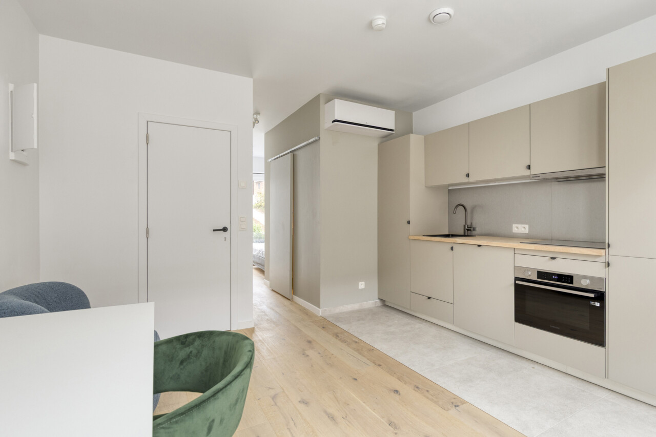 UNIT 01.01: Studio eerste verdieping (25,66 m2), privatieve keuken, badkamer en aparte slaapkamer.