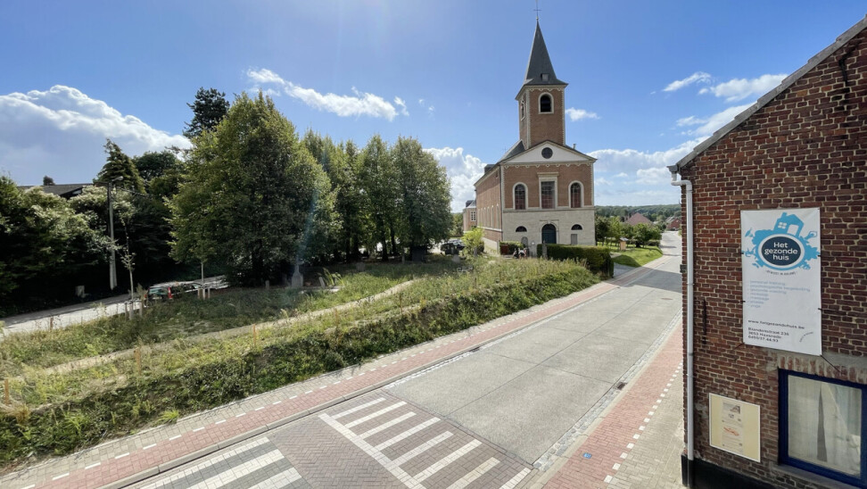 Het pand is gelegen in een rustige buurt, recht tegenover de kerk, met in de onmiddellijke nabijheid diverse voorzieningen zoals Spar, Aldi, een drankencentrale en een bakker. Deze ligging combineert vlot bereikbare dagelijkse faciliteiten met een rustige woonomgeving.