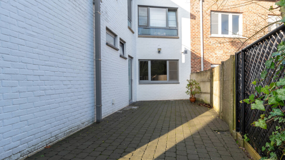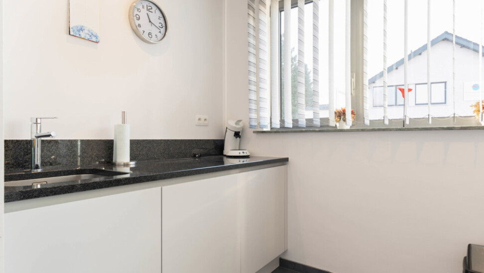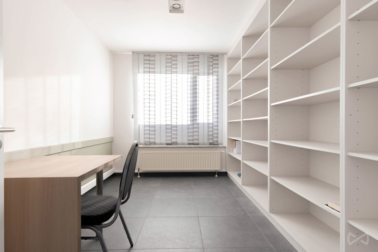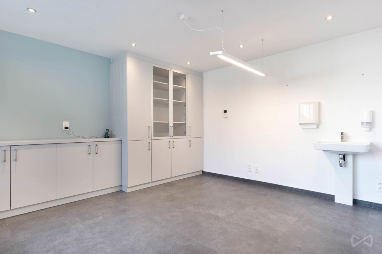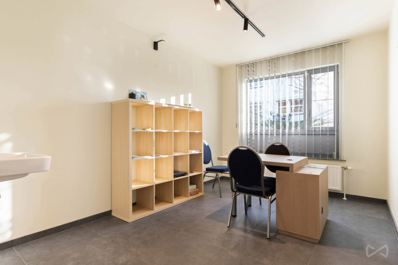 Het pand is op te delen in vier afzonderlijke kantoorruimtes, goed voor een totaal van 100 m². Je wordt er ontvangen in de inkomhal, met aansluitend de wachtzaal en receptie. De medewerkers kunnen tijdens de pauze terecht bij de ingebouwde keukenblok, perfect voor een koffiepauze. Daarnaast is er een buitenruimte waar men kan genieten van het terras en de tuin. In de gemeenschappelijke kelder, die toegankelijk is via een garagepoort, kan men veilig fietsen stallen of extra opslagruimte benutten.