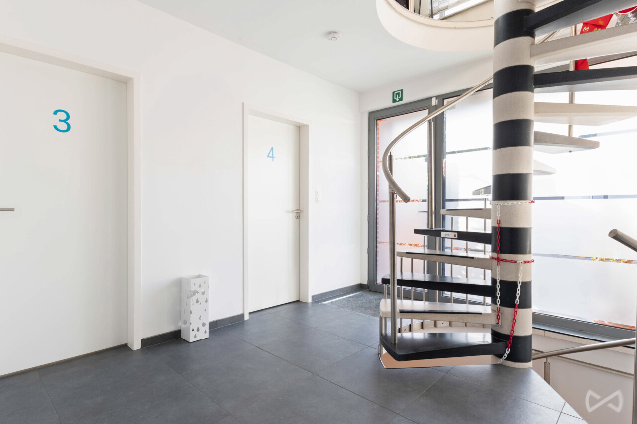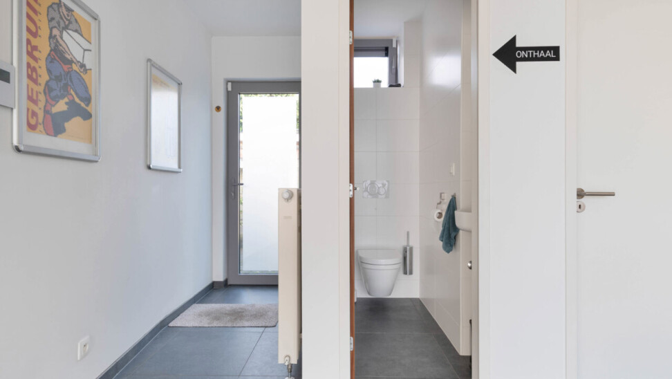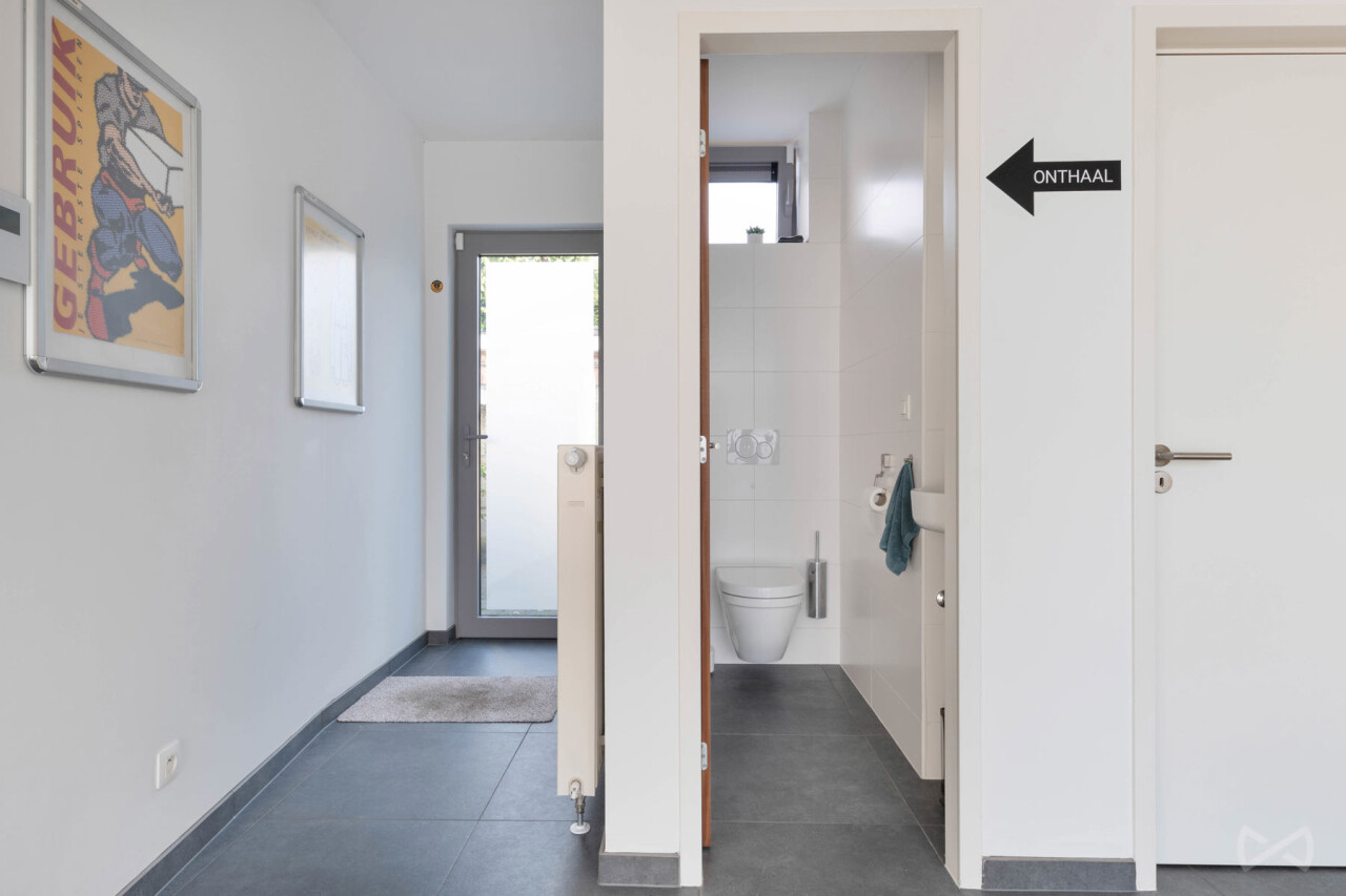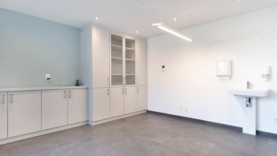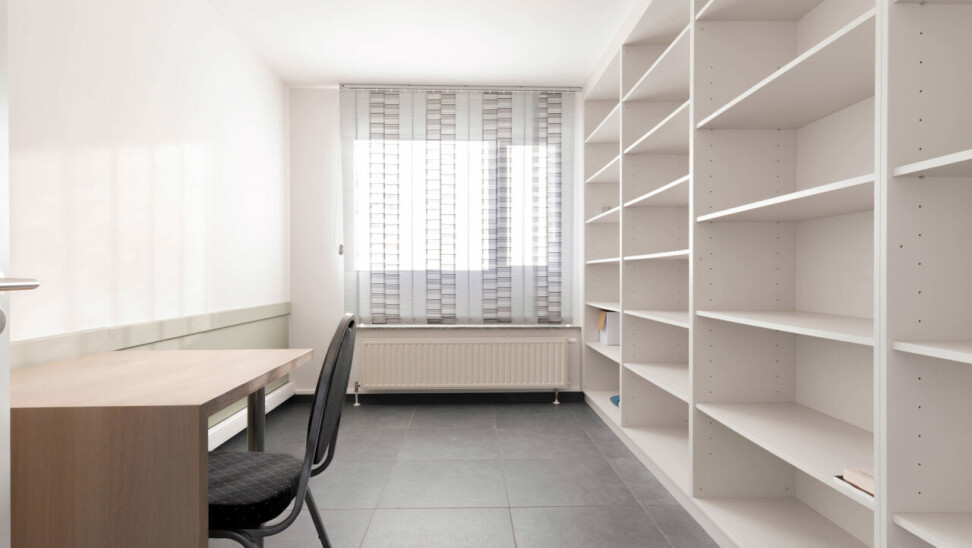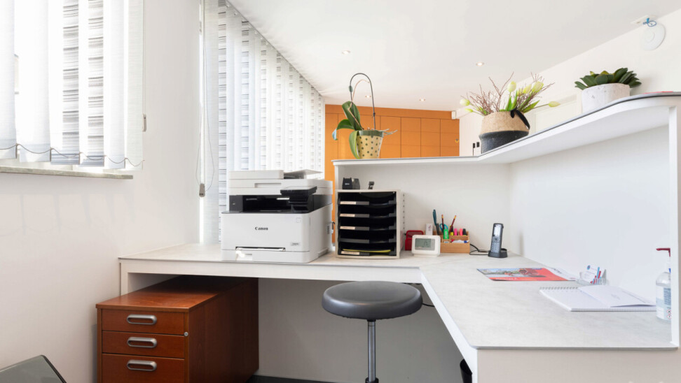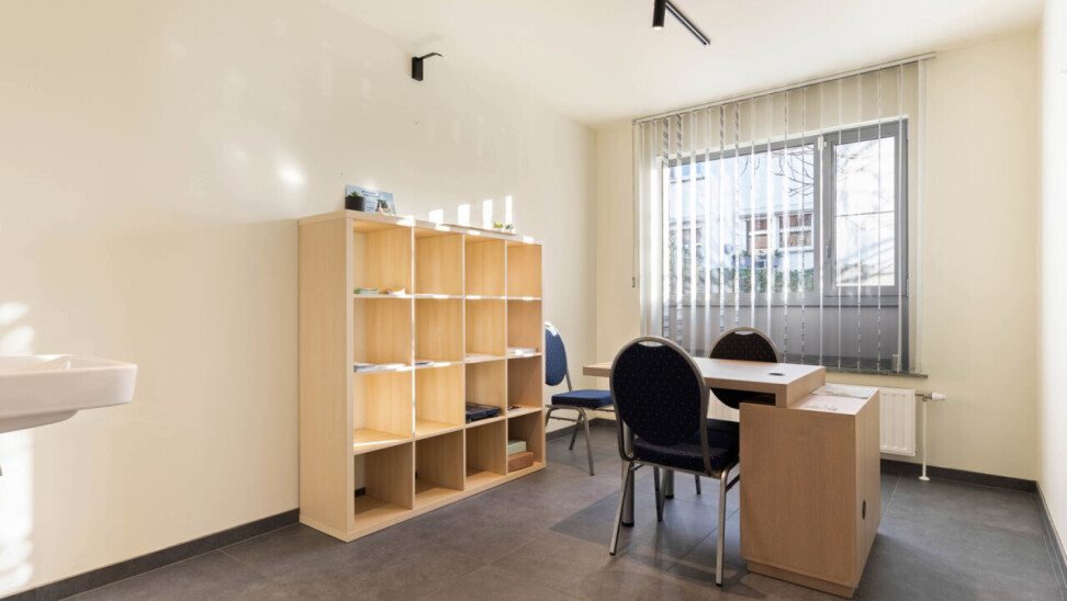 Het pand is op te delen in vier afzonderlijke kantoorruimtes, goed voor een totaal van 100 m². Je wordt er ontvangen in de inkomhal, met aansluitend de wachtzaal en receptie. De medewerkers kunnen tijdens de pauze terecht bij de ingebouwde keukenblok, perfect voor een koffiepauze. Daarnaast is er een buitenruimte waar men kan genieten van het terras en de tuin. In de gemeenschappelijke kelder, die toegankelijk is via een garagepoort, kan men veilig fietsen stallen of extra opslagruimte benutten.