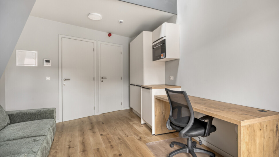 De residentie omvat 8 studentenkamers, elk uitgerust met eigen sanitair. Op het gelijkvloers is een inpandige fietsenstalling voorzien, terwijl de eerste verdieping beschikt over een gemeenschappelijke keuken met een aangenaam terras. Naast de functionele indeling zorgen de kwalitatieve materiaalkeuze en de hoogwaardige afwerking voor een duidelijke meerwaarde en een hedendaagse uitstraling van het gebouw.