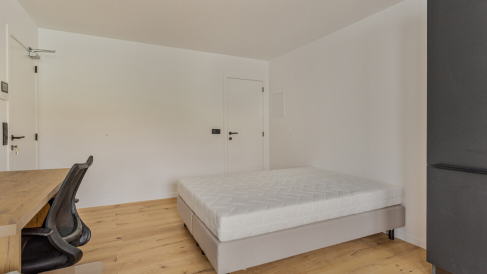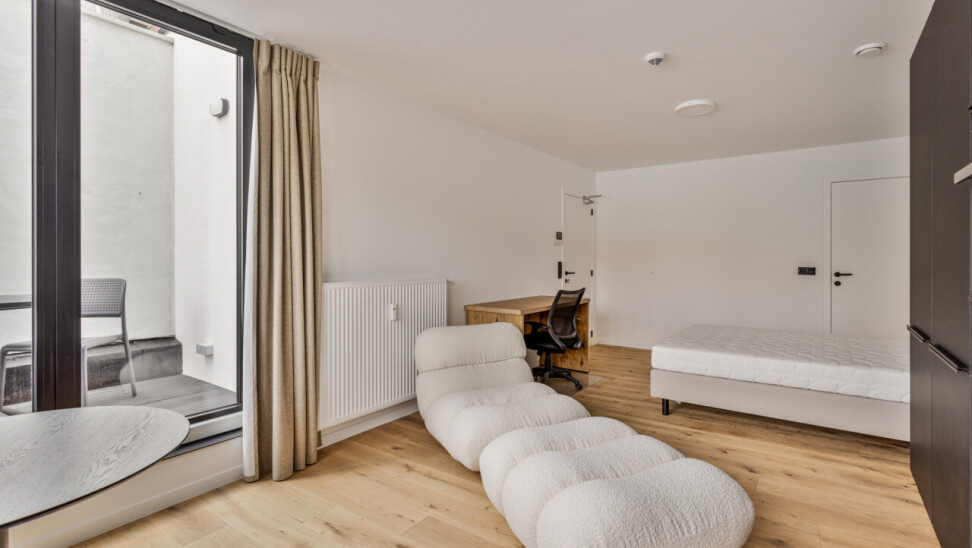 De studio is gelegen op de eerste verdieping, aan de achterzijde van het gebouw en beschikt over een privatieve keuken en badkamer, en bijkomend een privatief terras. Bovendien wordt de studio volledig bemeubeld verhuurd.
