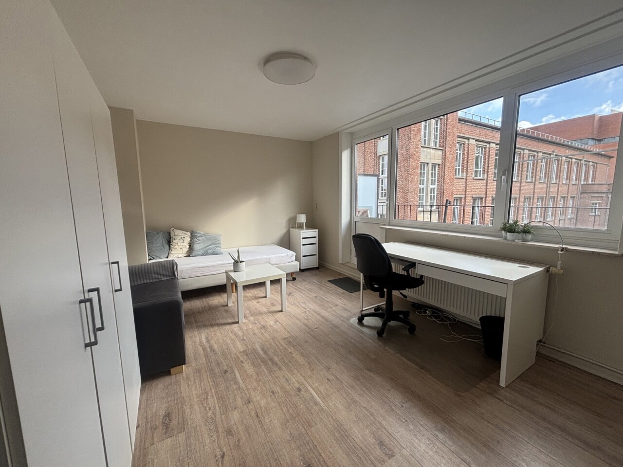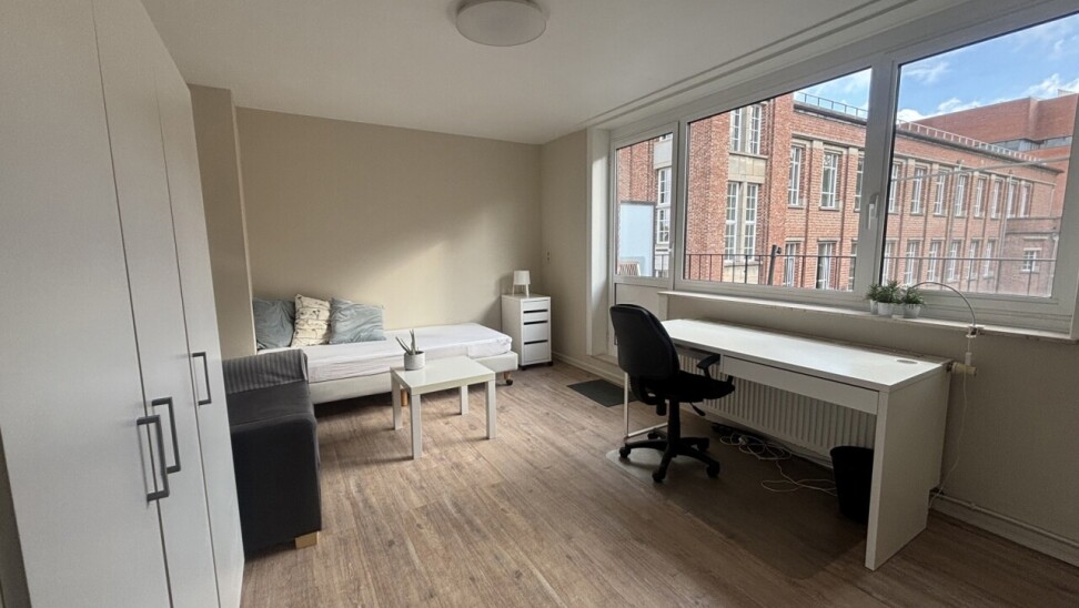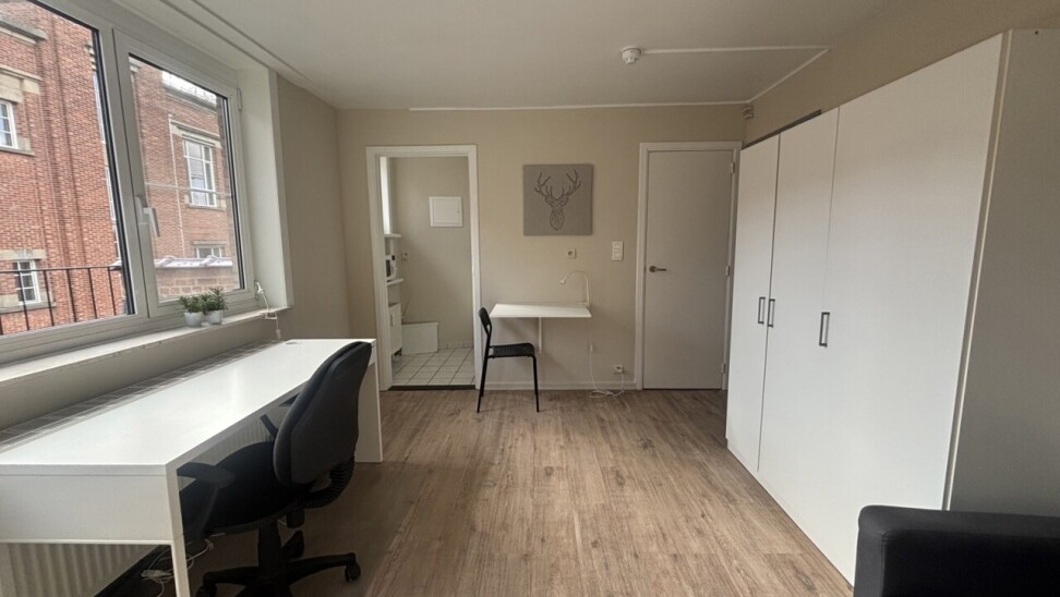 Welkom in de Schapenstraat, de autoluwe straat die de verbinding vormt tussen het Damiaanplein en de Tervuursevest. De locatie is een uiterste troef, je bevindt je in de buurt van allerlei faculteiten en faciliteiten. De studio is te vinden op de vierde verdieping en komt volledig bemeubeld. Vanuit de leefruimte/slaapkamer heb je toegang tot een ruim terras met prachtig uitzicht op het Groot Begijnhof. Er is een aparte kitchenette en geïnstalleerde badkamer aanwezig.