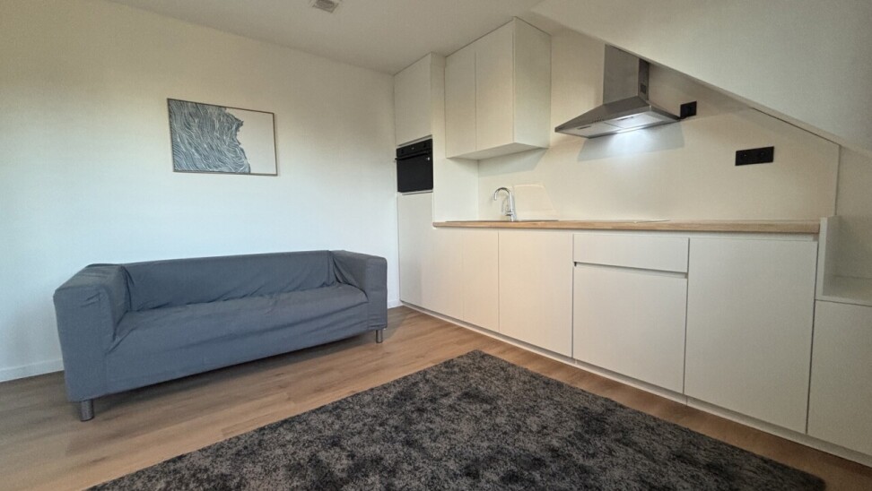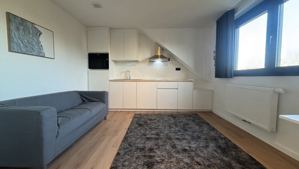 De gemeubelde studio, gelegen op de tweede verdieping biedt u een leefruimte met geïnstalleerde keuken. Slaapgedeelte met bureel en ingerichte badkamer met douche, toilet en lavabo.
