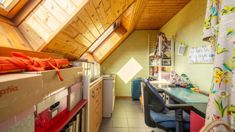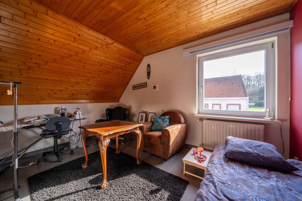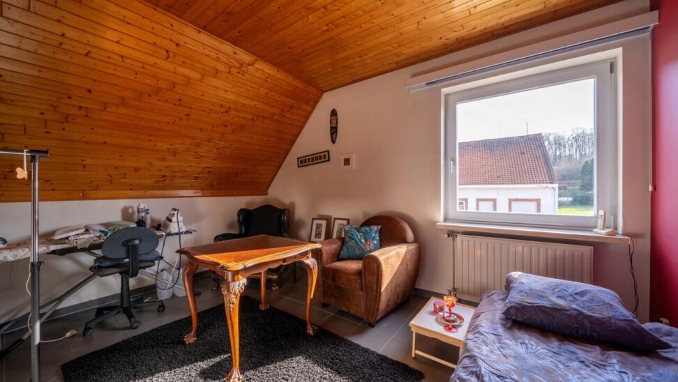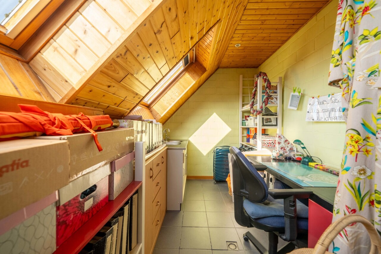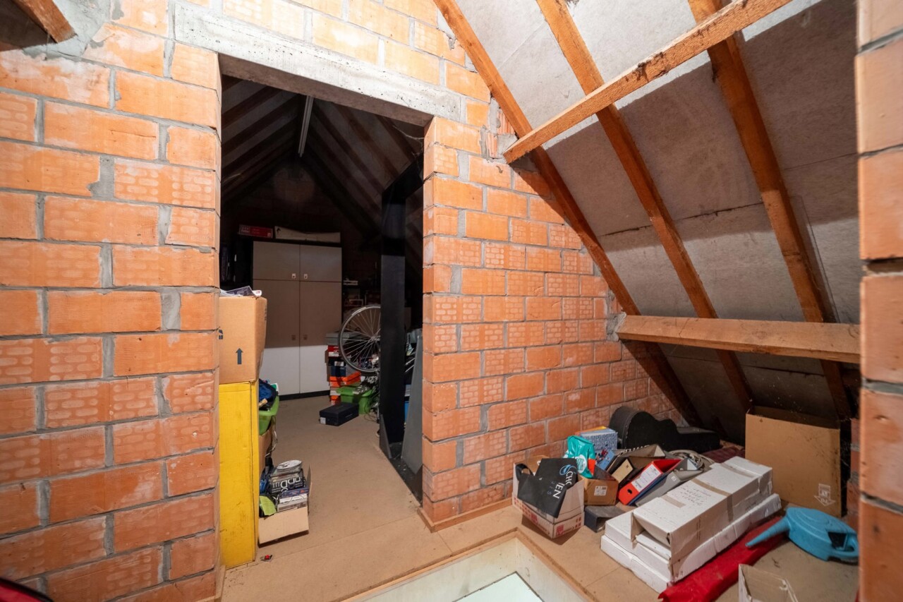 Binnenin vindt u een ruime en lichtrijke leefruimte met een gezellige houtkachel, ideaal voor sfeervolle momenten met het gezin. De geïnstalleerde keuken sluit aan op een praktische berging/wasplaats, wat zorgt voor extra comfort in het dagelijks gebruik. De woning beschikt over een badkamer met bad met massagefunctie, douche en dubbele lavabo, vier slaapkamers, waarvan één ter hoogte van de leefruimte die perfect kan dienen als bureau. Eén van de slaapkamers is bovendien voorzien van een aangrenzende ruimte die kan worden ingericht als dressing of bureau. Verder is er bijzonder veel bergruimte aanwezig. De geïsoleerde zolder biedt bovendien nog extra potentieel en kan na afwerking worden ingericht tot twee bijkomende kamers.